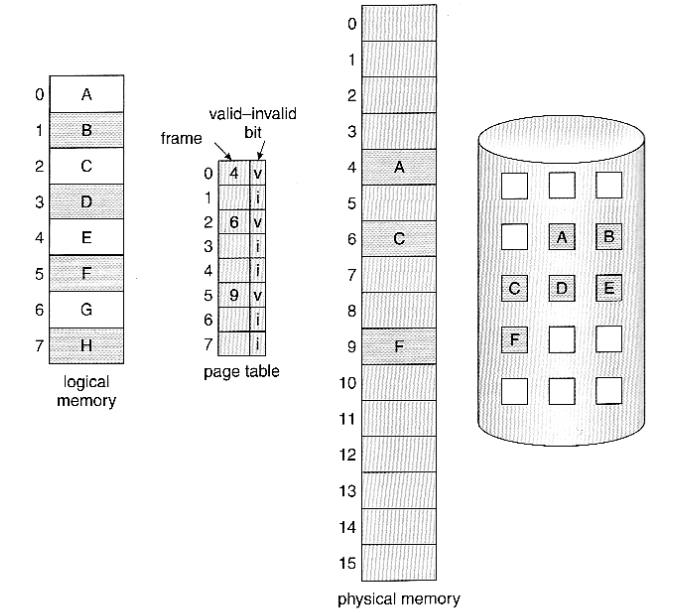 오른쪽 저장 장치에는 A~F까지의 논리적 주소가 있다. 물리 메모리를 보면 모두 적재되어 있지않다.