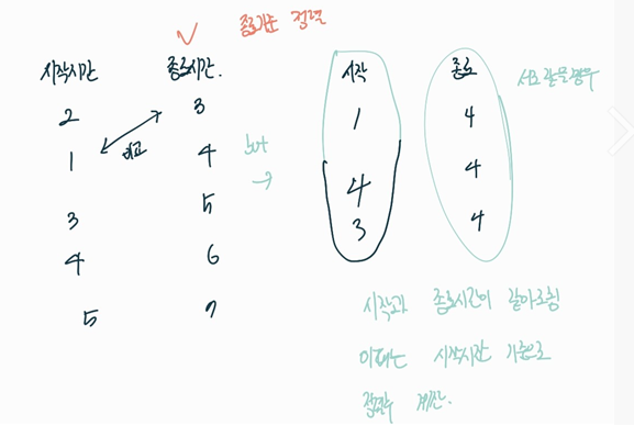 종료시간을 기준으로 정렬하지만 종료시간이 모두 같을 경우는 시작 시간 기준으로 정렬해 계산