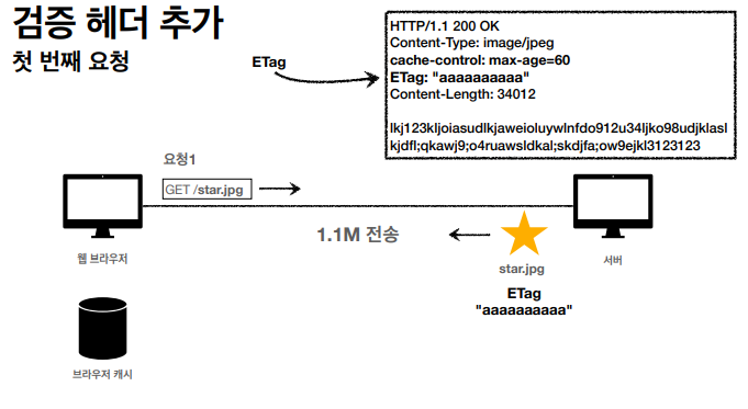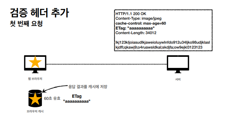 변하지 않았다면 데이터를 전송하는 대신에 저장해뒀던 로컬 캐시를 다시 사용할 수있다. but 서버에 있는 데이터가 변하지 않았다는것 을 확인 할 수 있어야 한다. -> 검증헤더 사용